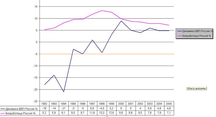 Отсутствие зависимостей между приростом ВВП и безработицей 1992-2005 гг. (Россия – данные http://pwt.econ.upenn.edu/php_site/pwt62/, http://www.gks.ru/)