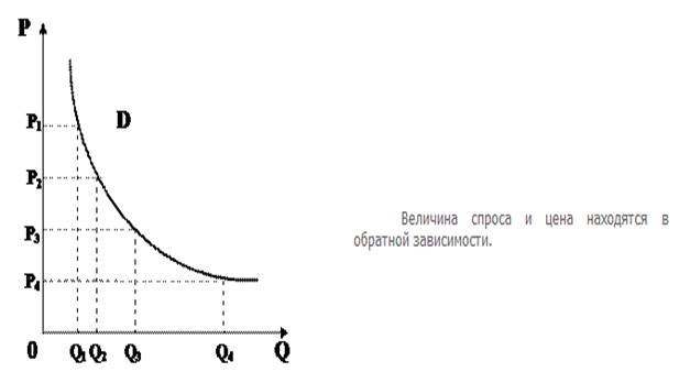 Кривая спроса отражает обратно пропорциональную зависимость между ценой и количеством блага, которое покупатели хотят и могут приобрести в единицу времени. Кривая спроса наклонена вниз, потому что снижение цены (при прочих равных условиях) означает увеличение спроса на товар.