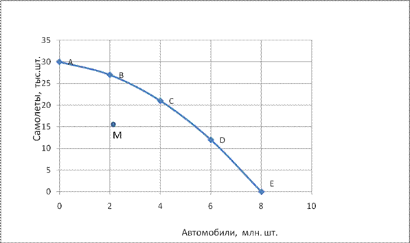 В данном случае точки A, B, C, D, E - точки, принадлежащие КПВ. Точка M внутри графика означает неполное или нерациональное использование имеющихся ресурсов. Точка W (вне кривой) недостижима при данном количестве ресурсов и имеющейся технологии. Попасть в эту точку можно, если увеличить количество используемых ресурсов или улучшить технологию производства (например, сменить ручной труд на машинный). При движении по кривой возможен только один, лучший вариант движения, который дает максимальный результат при минимальных затратах.