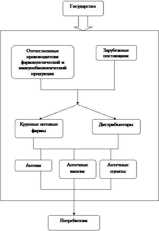 Товаропроводящая сеть российского фармрынка представлена его дистрибьюторским и розничным сегментами. В оптовой торговле заняты почти 6000 предприятий (источник: Минздрав России), хотя реально на рынке работает не большее 1000 дистрибьюторских компаний. В государственной собственности находится около 5% от общего количества оптовых структур, осуществляющих монопольную либо практически бесприбыльную реализацию специфических лекарственных средств. Структура конечного потребления представлена аптеками (примерно 20 000) по большей части государственной (муниципальной) формы собственности (с долей госсектора свыше 65%); приблизительно 35 000 аптечных пунктов (доля госсектора около 60%) и порядка 12 000 аптечных киосков, преимущественно частных (доля госсектора более 50%).