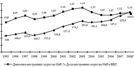 График 1. Внутренние затраты на ИиР в процентах к ВВП (1995-2008 гг.)[8]