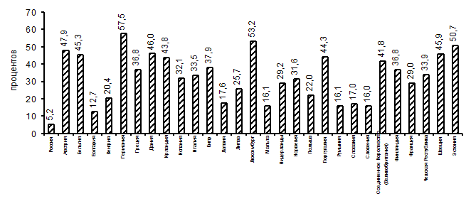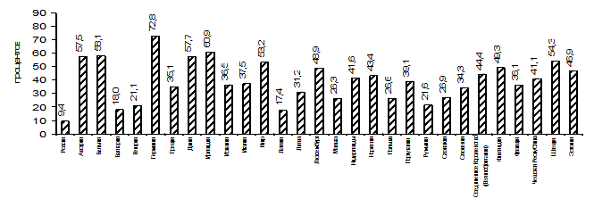 График 3. Удельный вес организаций, осуществлявших технологические инновации, в общем числе организаций промышленного производства (данные за 2007г.)[14]