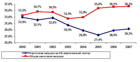 При рассмотрении распределения налогов по отраслям можно сделать вывод, что сравнительно велика лишь налоговая нагрузка в нефтяном секторе, где она превышает 60% от полной добавленной стоимости. В других отраслях налоговая нагрузка не выходит за границы 30% добавленной стоимости.