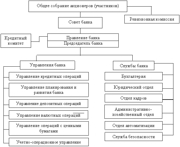 Каждый коммерческий банк обладает организационной структурой, определяющей состав его подразделений (отделов, служб, отделений, филиалов и др.). В зависимости от нее осуществляется разделение полномочий между инстанциями, передача распоряжений от вышестоящих инстанций к нижестоящим, координация деятельности различных подразделений банка. На нее влияют такие факторы, как величина