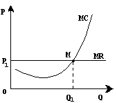 Ниже показано , что с увеличением производства кривая предельных издержек (МС ) идет вверх и пересекает горизонтальную линию предельного дохода , равного рыночной цене Р1 , в точке М , соответствующей объему производства Q1 . Любое отклонение от этой точки приводит к потерям для фирмы либо в виде прямых убытков при большем объеме производства , либо в результате сокращения массы прибыли при уменьшении выпуска продукции .