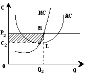 Если на каком-то интервале линия цены и предельного дохода располагается выше кривой средних издержек , то в точке равновесия М фирма будет получать квазиренту , т.е. прибыль , превышающую нормальный уровень . При оптимальном объеме производства Q2 средние издержки будут равны С2 , следовательно , валовые издержки составят площадь прямоугольника OC2 LQ2 . Валовая выручка (прямоугольник OP2 MQ2 ) будет больше , и площадь заштрихованного прямоугольника C2 P2 ML покажет нам общую массу получаемой сверхприбыли .