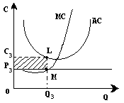 На третьем рисунке показана иная ситуация : средние издержки при любом объеме производства превышают рыночную цену . В этом случае даже при оптимальном объеме производства (МС=Р ) фирма несет убытки , хотя они и меньше , чем при других объемах производства ( площадь заштрихованного прямоугольника P3 C3 LM минимальна именно при объеме производства Q3 ) .