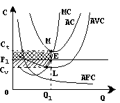 Рыночная цена Р1 ниже минимальных средних издержек , но выше минимальных средних переменных издержек . При оптимальном объеме производства Q1 величина средних издержек производства составит отрезок Q1 M , величина средних переменных издержек – отрезок Q1 L . Следовательно , отрезок ML – это средние постоянные издержки . Если фирма продолжает работать , то ее валовая выручка ( прямоугольник OP1 EQ1 ) будет меньше полных издержек ( прямоугольник OCт MQ1 ) , но при этом будут покрыты переменные издержки ( прямоугольник OCv LQ1 ) и часть постоянных издержек . Размер убытков будет измеряться площадью прямоугольника P1 C1 ME . Если же фирма остановит производство , то убытки составят всю величину постоянных издержек ( прямоугольник Cv Cт ML ) . Таким образом , пока цена выше минимальных средних издержек , фирме в краткосрочном периоде выгоднее продолжать производить продукцию , поскольку в этом случае минимизируются убытки . Если цена равна минимальным средним переменным издержкам , то для нее безразлично , продолжать производство или останавливать его . Если же цена упадет ниже минимальных средних переменных издержек , тогда производство продукции должно быть прекращено .