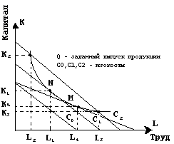 Фирма не может избрать изокосту С0 , т.к. нет такого сочетания факторов , которое обеспечило бы выпуск продукции Q при их стоимости , равной С0 . Заданный объем производства может быть обеспечен при расходах , равных С2 , когда затраты труда и капитала соответственно равны L2 и К2 или L3 и К3 . Но в этом случае издержки не будут минимальными , что не отвечает поставленной цели . Значительно эффективнее будет решение в точке N , т.к. при этом набор факторов производства обеспечит минимизацию издержек производства . Сказанное выше верно при условии , что цены на факторы производства неизменны . На практике так не бывает . Предположим , что цена капитала увеличится . Тогда угол наклона изокосты , равный – (w/ r ) , уменьшится , а кривая С1 станет более пологой . Минимизация издержек в данном случае будет иметь место в точке М со значениями L4 и К4 . В связи с увеличением цены на капитал фирма заменяет капитал трудом .