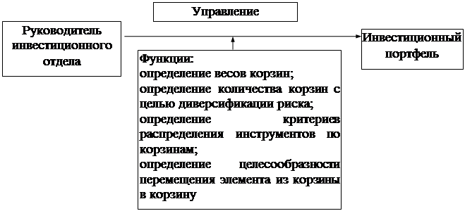 План действий по осуществлению инвестиций может структурироваться в соответствии с разделением портфеля на корзины, на элементы, на виды инвестиций, отражающие логику формирования портфеля, а также инвестиционную политику фирмы.