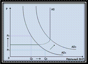 Пример : допустим, что непредвиденное увеличение зарубежного спроса на казахстанские товары увеличит уровень цен. Вследствие этого экономика переместится вдоль краткосрочной кривой совокупного предложения к уровню более высокого объема реального выпуска. Но в долгосрочном плане номинальная зарплата и цены других затрачиваемых факторов будут расти в ответ на более высокий уровень цен. Экономика вернется к своему потенциальному объему реального выпуска.
