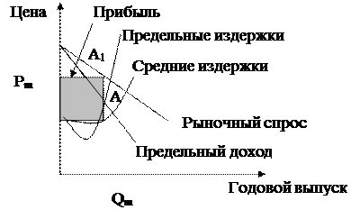 На графике (рис. 1.2 ) видно, что в случае, когда предельный доход равен предельным издержкам, максимизирующий прибыль объём производства составляет Qm . Цена, при которой количество Qm будет продано, определяется соответствующей точкой на кривой рыночного спроса. Найденная цена Pm есть максимизирующая прибыль. Поскольку цена Pm превышает значение средних издержек, то фирма получает совокупную экономическую прибыль, вычисляемую умножением прибыли, приходящейся на единицу продукции, на объём производства, максимизирующего прибыль, равную площади заштрихованного прямоугольника.