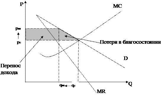 Если состояние отрасли характеризуется конкуренцией, цена будет на уровне р с , а количество произведённой продукции – на уровне q c . В случае монополизации цена повысится от р с до p m , а объём произведённой продукции уменьшится от q c до q m . Монополистические решения, касающиеся ценообразования и количества продукции, также вызовут перенос дохода от потребителей к производителям, что при условии неизменного размера издержек приведёт к увеличению чистой прибыли монополиста, как это изображено прямоугольником, заштрихованным по диагонали.