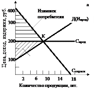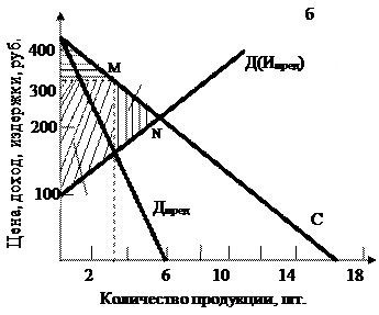 Рассмотрим более подробно ситуацию для монополии. С целью упрощения ситуации кривые спроса и предложения оставляем теми же, что и в случае совершенной конкуренции. Для извлечения максимальной прибыли монополист ограничивает объём производства на уровне не 8, а 4 ед. продукции и устанавливает цену 310 руб. за единицу. Потребители получают излишек, отображённый на рис. 1.4 площадью, ограниченной кривой спроса и линией цены. Монополист со своей стороны получает существенный излишек производителя. Четвёртая единица выпуска, проданная за 310 руб., заключает в себе лишь 150 руб. издержек производства и приносит тем самым излишек в размере 160 руб. Общие размеры излишков производителя-монополиста равны площади горизонтально заштрихованной части рис. 1.4,б.