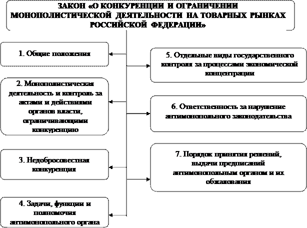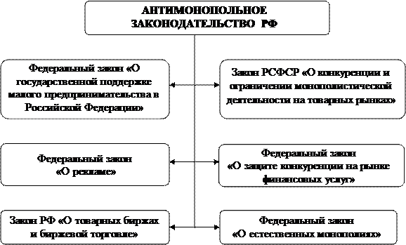 То, в какой мере государству удаётся обеспечить соблюдение установленных правил, определяет процесс становления конкурентных отношений и качественные характеристики конкуренции на товарных и финансовых рынках. Антимонопольное законодательство действует на всей территории России для большей части рынков товаров и услуг и имеет структуру, показанную на рис. 2.1.