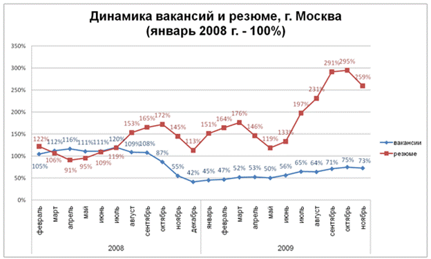 На приведенном ниже графике показана динамика числа вакансий и резюме в процентах относительно базового уровня. За базовый уровень принято число вакансий и резюме, размещенных на сайте hh.ru в январе 2008 г.