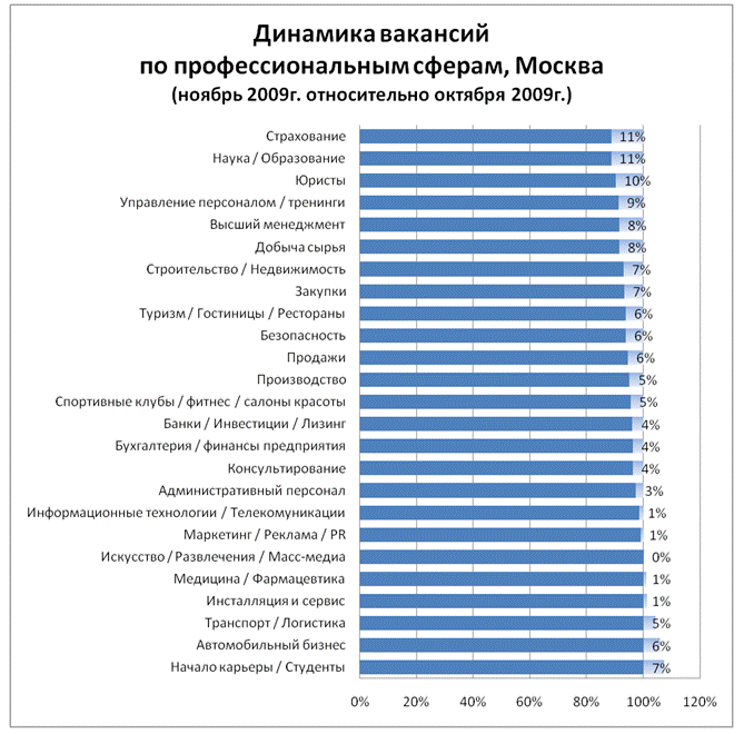 В отличие от октября 2009 г., в ноябре наблюдалось небольшое уменьшение числа публикуемых вакансий в большинстве профессиональных областей. Рост спроса происходил только в следующих профессиональных сферах:
