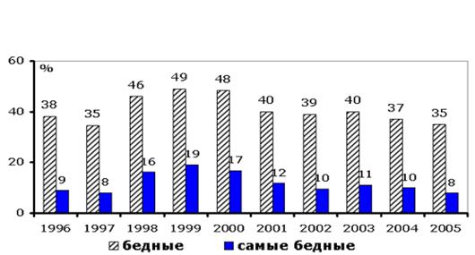 Однако для понимания природы бедности важно выделить группы бедных, различающиеся по относительному уровню субъективных оценок. Если определить группу самых бедных как тех, чьи субъективные оценки бедности не превышают средний по мнению всего населения уровень, то окажется, что они составляют около трети всех бедных. Материальное положение этой группы самых бедных семей действительно бедственное. Остальные бедные скорее тяготеют к средним слоям населения.