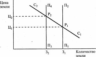 На рис. 1 показано, что происходит с ценой при сокращении земельных угодий, являющихся объектом купли-продажи на рынке земли, и при увеличении спроса на нее. Во многих случаях кривая предложения является строго фиксированной и принимает вертикальное положение, поскольку не изменяется под воздействием спроса. Первоначально эта кривая (П1 — П2) пересекается с кривой спроса (С1-С2) в равновесной точке Р1;, что приводит к образованию цены земли Ц1;. Однако при уменьшении количества земли с З1 до З2 кривая предложения (П3-П4)пересекается с кривой спроса в равновесной точке Р2, вследствие чего цена земли повышается с уровня Ц1 до уровня Ц2.