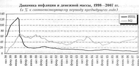 Несмотря на значительный прирост денежных агрегатов в посткризисный иериод, наблюдается ежегодное снижение темпов инфляции. Если в 1999 г. она составила 36,5%, то в 2006 г. снизилась до 9% в основном вследствие жесткой бюджетной политики, проводимой правительством России. В последние годы значительная часть сверхдоходов от продажи нефти и газа аккумулирована в Стабфонде, поэтому удалось избежать вброса в экономику значительной части валютной выручки.