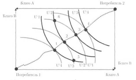 Пареnто-эффективными будут являться точки касания кривых безразличия. То есть в нашем примере это точки 1, 2, 3,4. Точки 5 и 6 не являются Паретто-эффективными, потому что характеризуют ситуации, при которых улучшение положения одного потребителя происходит за счет ухудшения положения другого (переход на более низкую кривую безразличия).