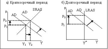 Произведение уровня цен на величину реального выпуска (P * Y) представляет собой величину номинального выпуска (номинального ВВП). Скорость обращения денег практически не меняется и обычно считается величиной постоянной, поэтому увеличение предложения денег, т.е. рост левой части уравнения, ведет к росту правой его части. Рост денежной массы ведет к росту уровня цен и в краткосрочном периоде (поскольку в соответствии с современными представлениями кривая совокупного предложения имеет положительный наклон) (рис. 1.2.(а)), и в долгосрочном периоде (которому соответствует вертикальная кривая совокупного предложения) (рис. 1.2.(б)). При этом в краткосрочном периоде инфляция сочетается с ростом реального выпуска, а в долгосрочном периоде реальный выпуск не меняется и находится на своем естественном (потенциальном) уровне [4, с. 58] .