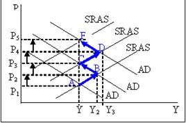 Рабочие снова начнут требовать повышения номинальной заработной платы. Ее рост рабочие обычно поначалу воспринимают как повышение реальной заработной платы и увеличивают потребительские расходы. Совокупные расходы растут, кривая совокупного спроса сдвигается вправо до AD3, уровень цен возрастает до Р4. При этом растут издержки фирм, и кривая совокупного предложения сдвигается влево-вверх до SRAS3, что обусловливает еще больший рост уровня цен до Р5. Падение реальных доходов ведет к тому, что рабочие опять начинают требовать повышения заработной платы и все повторяется снова. Движение идут по спирали, каждый виток которой соответствует более высокому уровню цен, т.е. более высокому темпу инфляции (из т. А в т.В, затем в т.С, далее в т.D, потом в т.F и т.д.). Поэтому этот процесс получил название инфляционной спирали или спирали «заработная плата – цены». Рост уровня цен провоцирует повышение заработной платы, а рост заработной платы ведет к повышению уровня цен [5, с. 113].