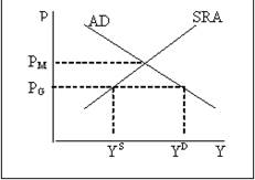 • Подавленная (скрытая) инфляция имеет место в случае, когда цены устанавливает государство, причем на уровне ниже, чем равновесный рыночный (устанавливаемый по соотношению спроса и предложения на товарном рынке) (рис. 1.6). Главная форма проявления скрытой инфляции – дефицит товаров.