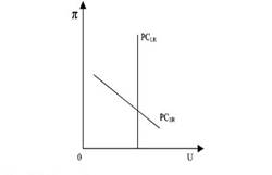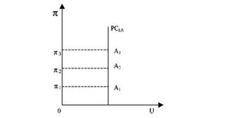 В ходе глубокого экономического кризиса 1974-75 гг. сложилась ситуация, получившая название стагфляции, когда высокие темпы инфляции существовали одновременно с высоким уровнем безработицы. В 80е годы безработица и инфляция одновременно снижались, т.е. они находились не в обратной, а в прямой зависимости (стагфляция может быть изображена смещением кривой Филлипса вправо). Это подорвало доверие к теории Филлипса и экономической политике, проводимой на ее основе. Анализ кривой Филлипса в новых условиях дали Э.Фелпс и М.Фридмен на основе теории естественного уровня безработицы. Согласно этой теории в долгосрочном периоде кривая Филлипса вертикальна. Если фактический уровень безработицы равен естественному, то рынок труда приходит к равновесному состоянию, и фактический уровень инфляции равен ожидаемому. (Рис.1.7.)