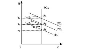 Экономисты отмечали связь темпов инфляции с уровнем безработицы. Эта зависимость наглядно описана в модели профессора Лондонской школы экономики А. Филлипса. Он исследовал статистические данные по Великобритании за период с 1861 по 1957 гг. и пришел к выводу, что когда безработица превышала 3% ный уровень, темпы роста цен и заработной платы начинали снижаться. Графическое изображение этой зависимости получило название кривой Филлипса. Позднее в его модели П. Самуэльсон и Р. Солоу заменили темп прироста заработной платы на показатель инфляции. Кривая Филипса показывает обратную зависимость инфляции и безработицы в краткосрочном периоде и возможность выбора, компромисса между ними. В краткосрочном периоде инфляционное повышение цен и заработной платы стимулирует предложение труда и расширение производства. Подавление инфляции сопровождается ростом безработицы. Условия компромисса определяются наклоном кривой Филипса [13, с. 107].