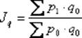 Один из них основывается на применении индекса (формулы) Ласпейреса: сравниваются цены текущего периода (р1 ) и базового (р0 ) на одинаковый набор товаров (товарную корзину) (q 0 ). Формула Ласпейреса показывает, на сколько фиксированная товарная корзина становится дороже в текущем периоде.