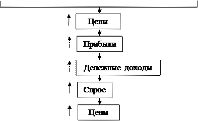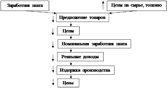 Другой вид инфляции – инфляция издержек. В этом случае механизм инфляции начинает раскручиваться в силу того, что растут издержки. Возможны два исходных момента: издержки начинают расти в результате повышения заработков или в силу удорожания сырья и топлива (рост импортных цен, изменение условий добычи, повышение транспортных расходов и т.п.) (рис.3).