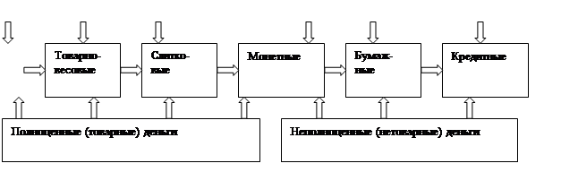 Современные деньги подразделяются на наличные и безналичные, к ним относятся монеты, бумажные и кредитные деньги. Развитие кредитных денег прошло следующие стадии: вексель, банкнота, чек, электронные деньги, кредитные карточки – все они используются в настоящее время.