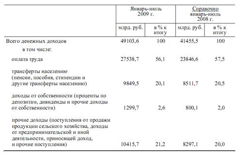 В январе-июле 2009 г. объем денежных доходов населения составил 49,1 трлн. рублей и по сравнению с январем-июлем 2008 г. увеличился на 18,4% при росте потребительских цен на товары и услуги за этот период на 14,4%. В результате как реальные денежные доходы (с учетом индекса потребительских цен), так и реальные располагаемые денежные доходы (за вычетом налогов и взносов) увеличились на 3,5%.[11]
