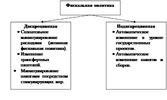 Дискреционная фискальная политика – целенаправленное изменение государственных расходов (государственные закупки товаров и услуг, трансферты) и налогов и состояния государственного бюджета в результате специальных решений правительства. К числу наиболее распространённых способов, средств осуществления дискреционной фискальной политики относят общественные работы, программы материальной помощи, государственная программа занятости, изменение налоговых ставок и другие аналогичные инструменты воздействия. Изменение их влияния приводит к изменению совокупных расходов, а, следовательно, и объёма национального производства.