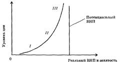 На первом отрезке кривой общие расходы до такой степени низки, что объем валового национального продукта отстает от своего максимального уровня. Уровень безработицы высок, большая доля производственных мощностей бездействует.