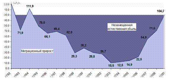 При этом даже миграция, которая имела значительные масштабы в первой половине 90-х годов, не компенсировала этой тенденции.