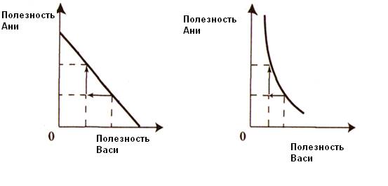 Если утилитаристская общественная кривая безразличия имеет линейный вид, причем ее наклон равен -1, как в случае а, то снижение полезности Васи будет компенсироваться точно таким же приращением полезности Ани. Индивидуальные полезности дохода, следовательно, у этих двух членов общества совершенно одинаковы. Если же общественная кривая безразличия выпукла к началу осей координат (вариант б), то мы видим, что, уменьшение полезности для Васи должно компенсироваться более чем равным, приращением полезности Ани, поскольку только таким образом остается неизменной суммарная полезность общества в целом. Это означает, что члены общества имеют не одинаковую функцию индивидуальной полезности. Таким образом, согласно утилитаристскому подходу, общество может считать справедливым как равное, так и неравное распределение доходов, в зависимости от представлений о характере индивидуальных функций полезностей разных членов общества. Нетрудно заметить, что в случае а) утилитаристская концепция совпадает с эгалитаристской: поскольку все люди обладают совершенно одинаковой способностью извлекать предельную полезность из своего дохода, то справедливым будет его уравнительное распределение.