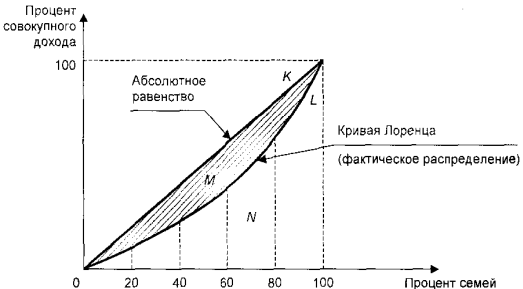 Теоретическая возможность абсолютно равного распределения дохода представлена биссектрисой, которая указывает на то, что любой данный процент семей получает соответствующий процент дохода. Это значит, что если 20, 40, 60% семей получают соответственно 20, 40, 60% от всего дохода, то соответствующие точки будутрасположены на биссектрисе. Кривая Лоренцапредставляет собой кумулятивное распределение численности населения и соответствующих этой численности доходов. В результате она покажет соотношение процентов всех доходов и процентов всех их получателей. Если бы доходы распределялись равномерно, т.е. 10% получателей имели бы десятую часть доходов, 50% — половину и т.д., то такое распределение имело бы вид линииравномерного распределения. Неравномерное распределение характеризуется кривой Лоренца, т.е. линией фактического распределения, отстоящей от прямой тем дальше, чем больше дифференциация. Например, 20% населения с самыми низкими доходами получили 5% общего дохода, 40% с низкими доходами — 15% и т.д.