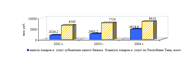 По данным Тывастата, выпуск товаров и услуг субъектами малого предпринимательства в 2004 году составил 4818,6 млн. рублей, или в сравнении с 2003 годом увеличился на 81%в фактических ценах. Удельный вес выпуска товаров и услуг субъектами малого предпринимательства в 2004 году составил 57,3% от общего выпуска товаров и услуг по республике.