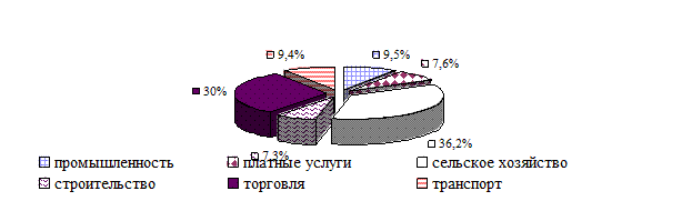 В структуре выпуска товаров и услуг малого предпринимательства основную долю занимает сельское хозяйство – 36,2 %, торговля и общественное питание – 30 %, промышленность и транспорт – 9,5 %, строительство–7,3% и услуги - 7,6%.