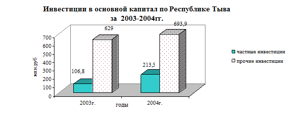На территории Республики Тыва объем инвестиций в основной капитал в 2004 году составил 907,4 млн. рублей, что выше уровня прошлого года на 1,2%. За январь-сентябрь 2005 года инвестиции в основной капитал по полному кругу предприятий и организаций по видам экономической деятельности использовано на сумму 583,5 млн. рублей, ИФО составил 102,1%. На частную форму собственности приходится 24,7 %(ИФ) – 161,4%).