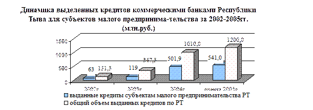 За январь-сентябрь 2005 года ОАО «Россельхозбанк», ОАО АБ «Народный банк РТ», ТРФ АКБ «Связь-банк», ОАО Банк «Тувакредит», ТФ ОАО АКБ «Росбанк», ТРФ КБ «Сибирское ОВК» и Кызылским ОСБ № 8591 Сбербанка России предпринимателям предоставлены кредиты на сумму 301,3 млн. рублей, темп роста составил 74,1%, заключено 337 договоров.