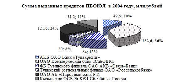 В структуре выданных кредитов ПБОЮЛ за январь-сентябрь 2005 г. существенную долю занимают АКБ ОАО банк «Тувакредит», Кызылское ОСБ № 8591 Сбербанка России, Тувинский региональный филиал ОАО «Россельхозбанк».