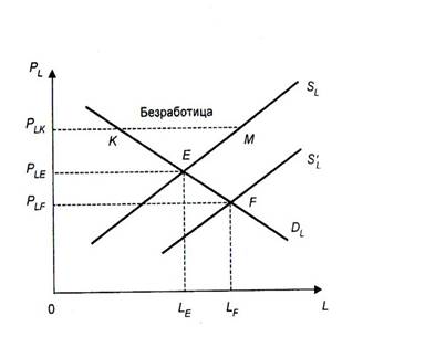 Соединив графики спроса и предложения, получим неоклассическую модель рынка труда, показывающую, что все желающие работать могут найти работу при сложившейся равновесной ставке заработной плате P LE . Если предложение труда возрастет (сдвиг кривой S L в положение S ˈ L ), то это приводит к снижению заработной платы до P LF и равновесие на рынке труда устанавливается в точке F .