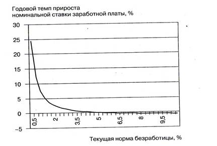 Кривая пересекала горизонтальную ось при норме безработицы около 5,4%. В послевоенный период времени денежная масса и заработная плата не уменьшались, поэтому кривая Филлипса расположена выше горизонтальной оси, которую она пересекает. Что касается другой оси, то очевидно, что какая-то норма безработицы всегда будет существовать независимо от темпа инфляции, вызванной ростом заработной платы.