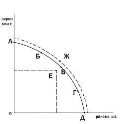 В данном случае точки А, Б, В, Г, Д - точки, принадлежащие КПВ. Точка E внутри графика КПВ означает неполное или нерациональное использование имеющихся ресурсов . Точка Ж (вне кривой) недостижима при данном количестве ресурсов и имеющейся технологии. Попасть в эту точку можно, если увеличить количество используемых ресурсов или улучшить технологию производства (например, сменить ручной труд на машинный). При движении по кривой возможен только один, лучший вариант движения, который дает максимальный результат при минимальных затратах. Кривая производственных возможностей показывает совокупность всех точек или решений, в пределах которых следует выбирать оптимальный вариант. Все остальные точки представляют собой упущенные возможности или альтернативные затраты .