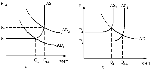 Инфляция спроса возникает как следствие избыточных совокупных расходов (AD1 -> AD2 ), (например, из-за роста зарплаты) в условиях, близких к полной занятости (Qf.e ). Рост AD стимулирует не столько объемы производства, сколько рост цен (Р1 -> Р2 ) (а).