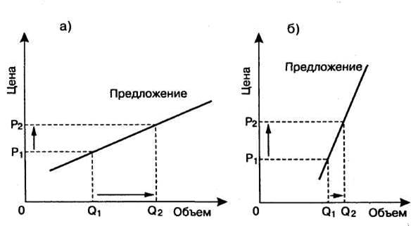 Рис. 1.1. Эластичность предложения по цене: а) эластичное предложение; б) неэластичное предложение