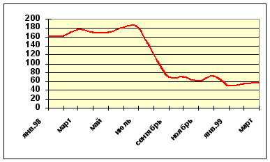 Аналогичная ситуация складывается и с реальной средней заработной платой. Начисленная номинальная заработная плата, по данным Госкомстата РФ, составила в марте 1999г. 1295 руб. и возросла по сравнению с мартом 1998г. на 20,4%16. Тем не менее, в долларовом эквиваленте она снизилась более чем в 3 раза. Еще летом 1998г. средняя зарплата по России составляла 180 долл. США, то в марте 1999г. она опустилась в среднем по всем отраслям экономики до 54 долл. США. (См. рис.4)